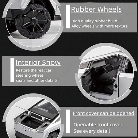This toy car is made using a high-quality die-cast metal body with strong plastic parts, giving it a solid feel and long life. The sharp body shape, wide wheels, detailed windows, and clean finish closely match the real Tesla Cybertruck design. It looks stylish and stands out among regular toy cars.