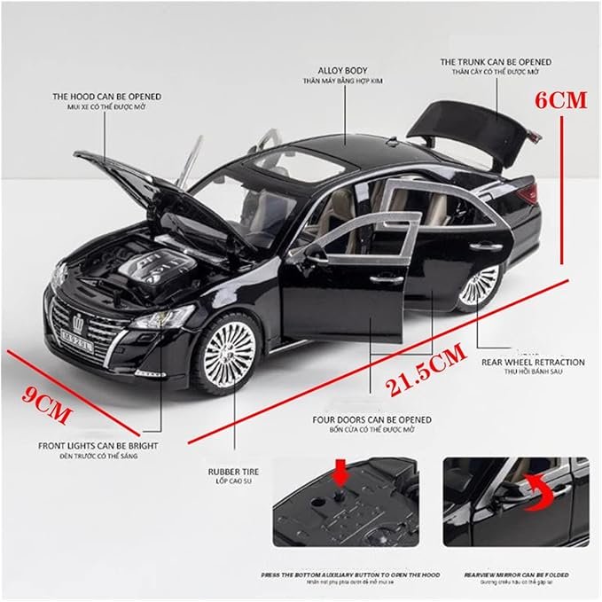 This model is made in a 1:24 scale size, giving it a big and realistic appearance. The die-cast alloy metal body provides strength, weight, and durability, making the car feel premium in hand. Compared to plastic toy cars, this metal Toyota Crown model lasts longer and looks more realistic, making it suitable for both play and display.