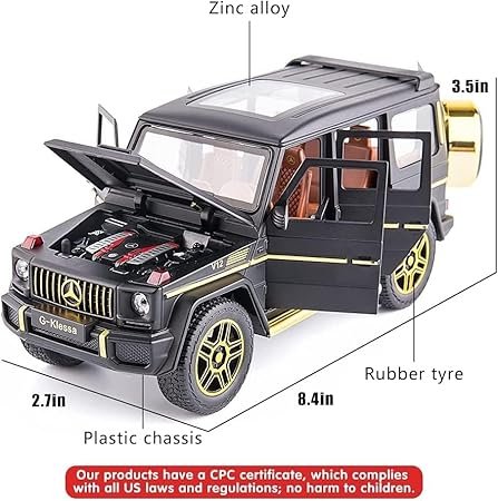 This Mercedes G-Class AMG G63 Diecast Model Car features a sturdy metal body, pullback function, openable doors, LED lights, and realistic engine sounds!