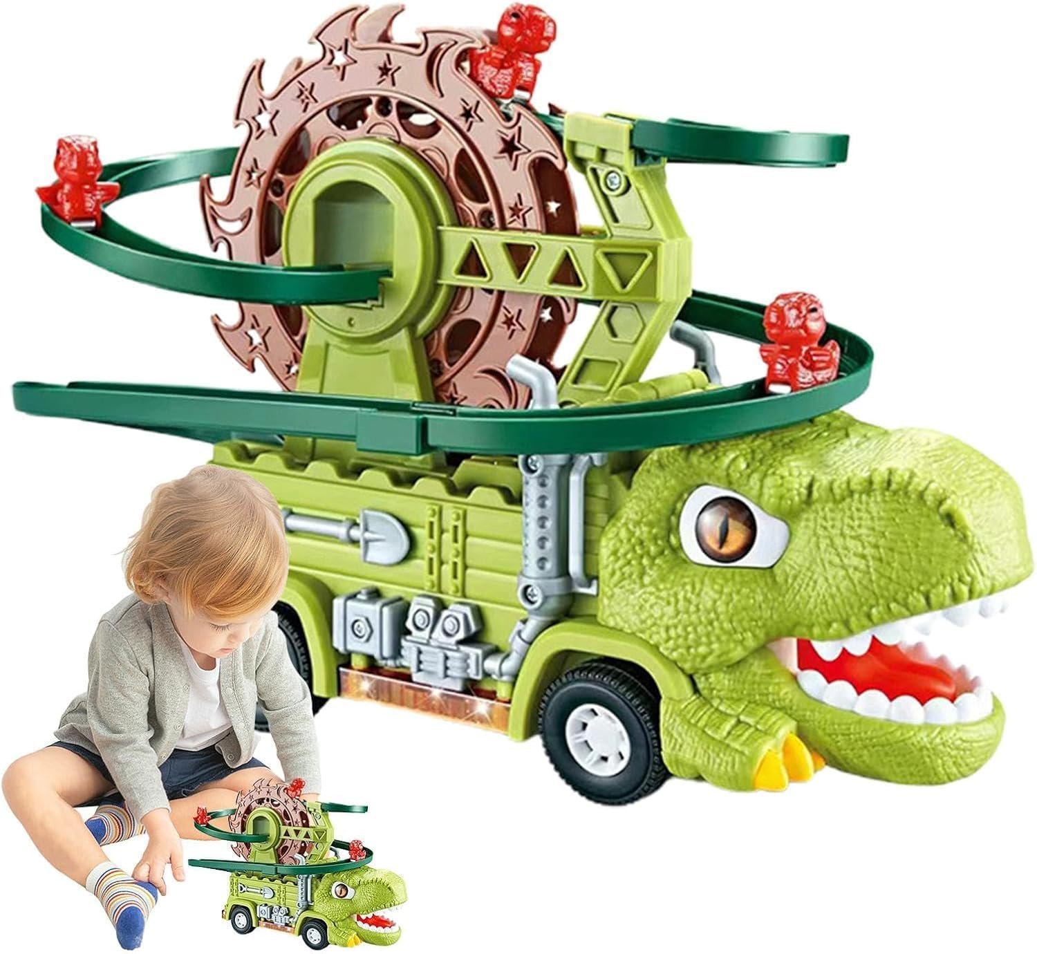 Dinosaur track racing toy with stair slide, lights, and music. Fun moving car toy for kids that supports active play and learning.