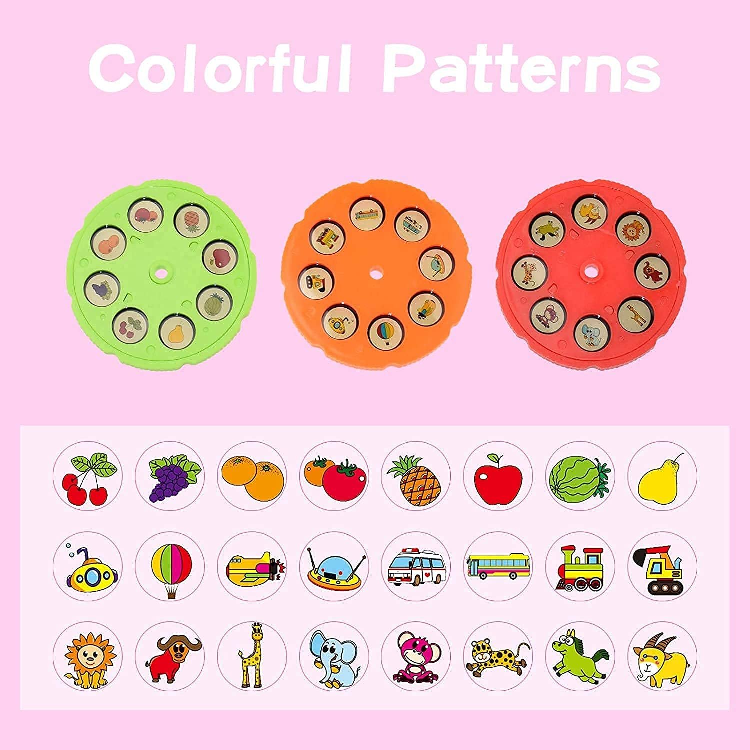 • 3 Interchangeable Discs (24 Patterns): Provides endless variety, from animals to vehicles, keeping your child engaged and preventing boredom. Furthermore, it introduces them to different shapes and figures.