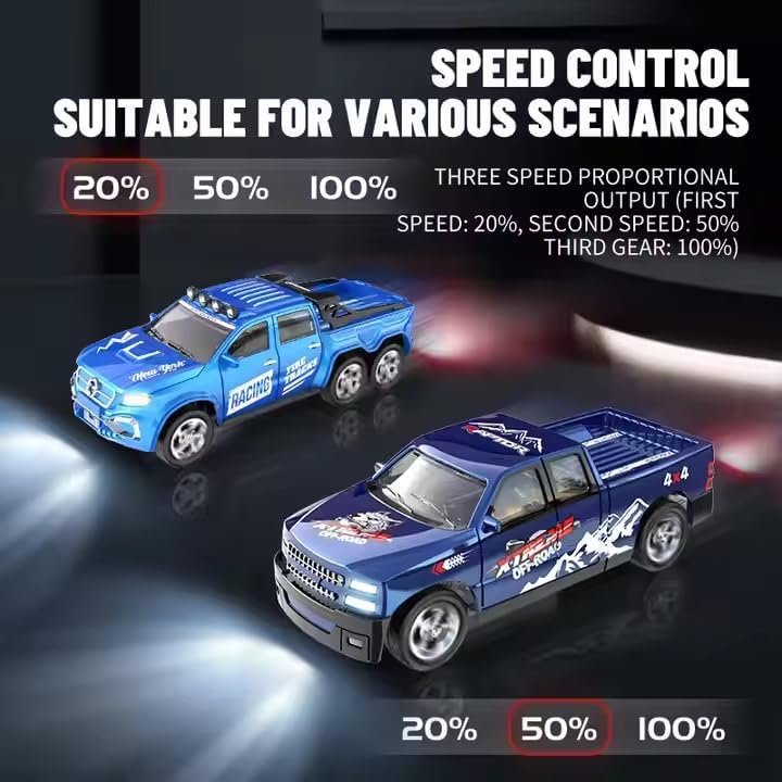 Mini RC car in 1:64 scale with off-road design, 2.4GHz remote control and three speed modes. Easy control and fun racing toy for kids.