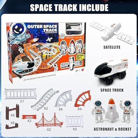 Outer space track playset with battery operation. Educational toy for kids that improves creativity, motor skills, and indoor play fun.